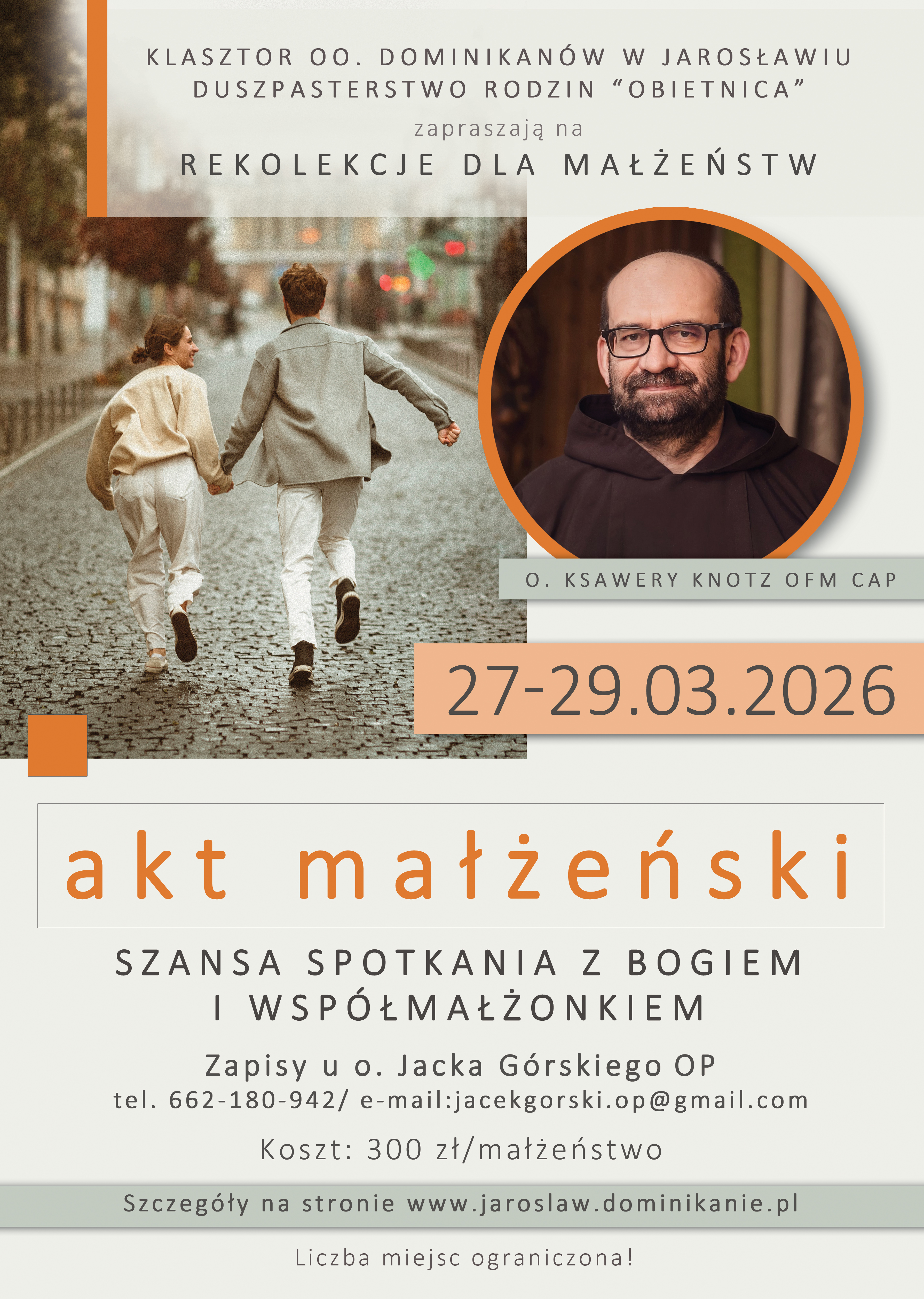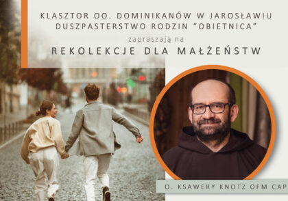 Duszpasterstwo małżeństw „obietnica” przy klasztorze oo. Dominikanów w Jarosławiu zaprasza na trzydniowe, weekendowe rekolekcje pod tytułem „Akt małżeński. Szansa spotkania z Bogiem i współmałżonkiem”, które poprowadzi ojciec Ksawery Knotz – zakonnik i kapłan, dr teologii pastoralnej i duszpasterz małżeństw kierujący swoją misję kaznodziejską na zgłębianie kwestii moralnych związanych z więzią małżeńską i życiem seksualnym małżonków. Rekolekcje rozpoczną się w dniu 27.03.2026 r. (piątek) od godziny 17:00 (recepcja przy klasztornej kawiarence, która będzie miejscem spotkań) i potrwają do niedzieli 29.03.2026 r. do godziny 14:00. Szczegółowy plan rekolekcji oraz informacje dotyczące zapisów dostępne są poniżej:
